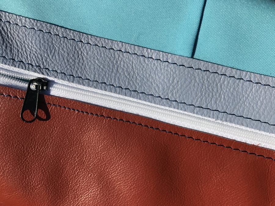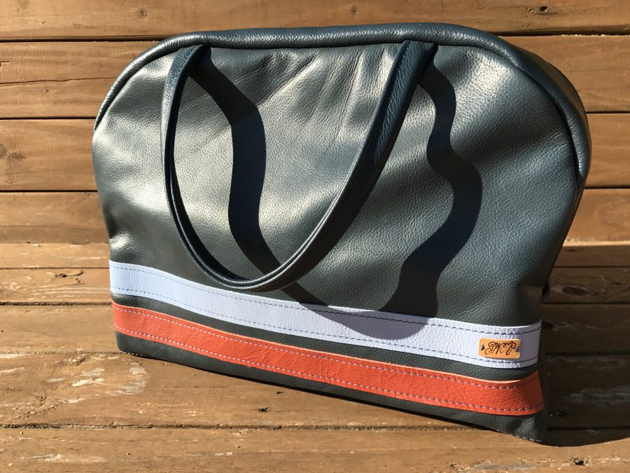 Pour cet article nous avons été inspiré, une nouvelle fois, de l’univers automobile. Il est réalisé en cuir recyclé bleu foncé avec des bandes bleu clair et orange. L’intérieur est également en tissu recyclé couleur turquoise avec une poche zippée en cuir.